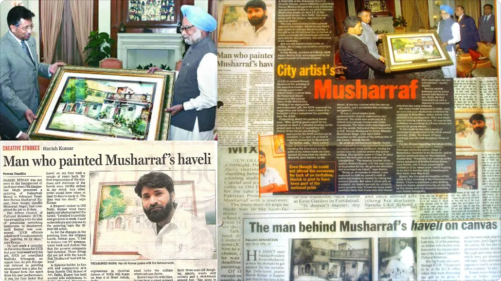 The iconic moment when Indian Prime Minister Dr. Manmohan Singh presented Harish Kumar’s painting of Nahar Wali Haveli to Pakistani President Pervez Musharraf.
